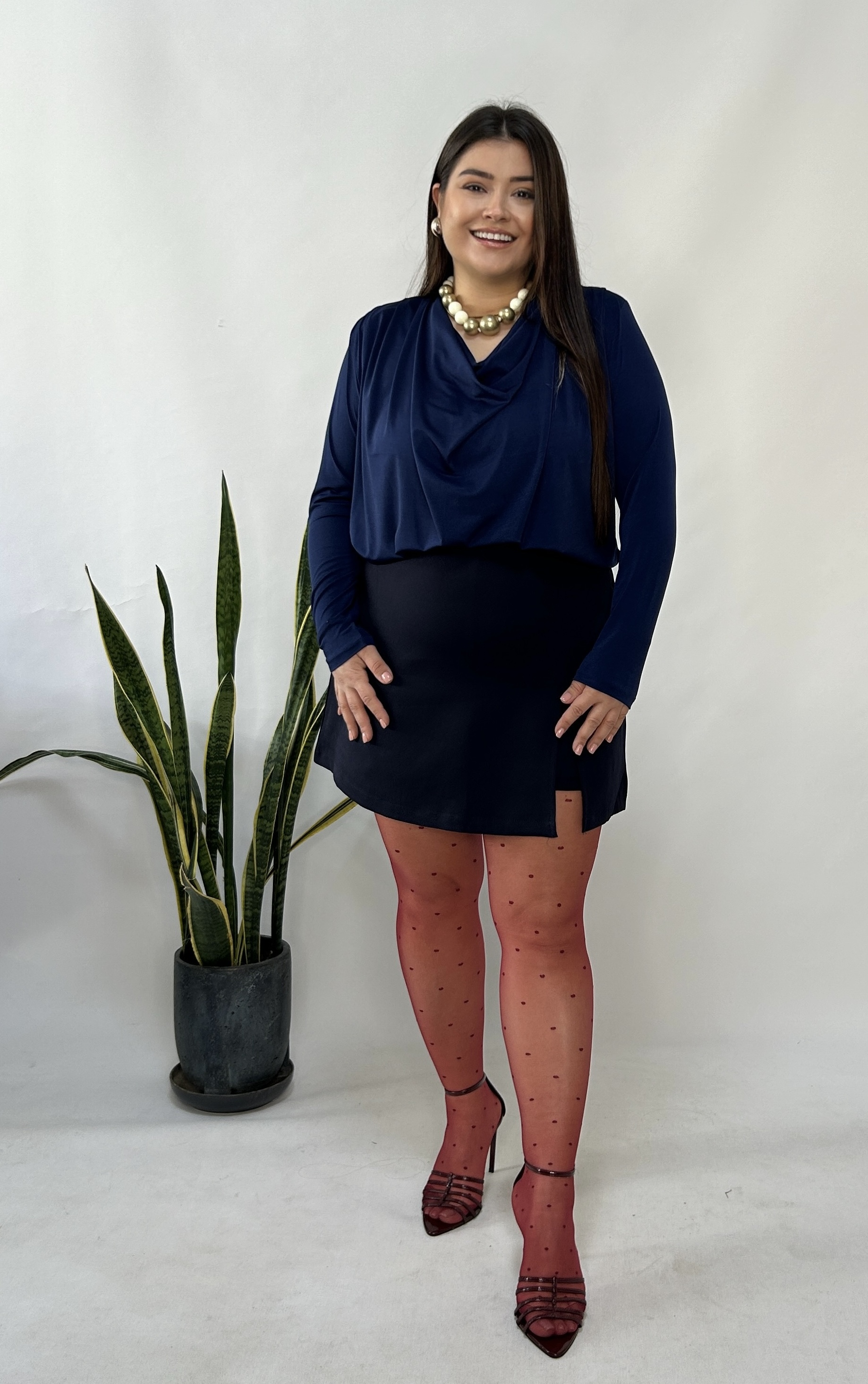 Etek görünümü ve iç şort rahatlığını bir arada sunan tek yırtmaçlı şort etek, büyük bedenlerde konforlu ve zarif bir stil için ideal bir parçadır.